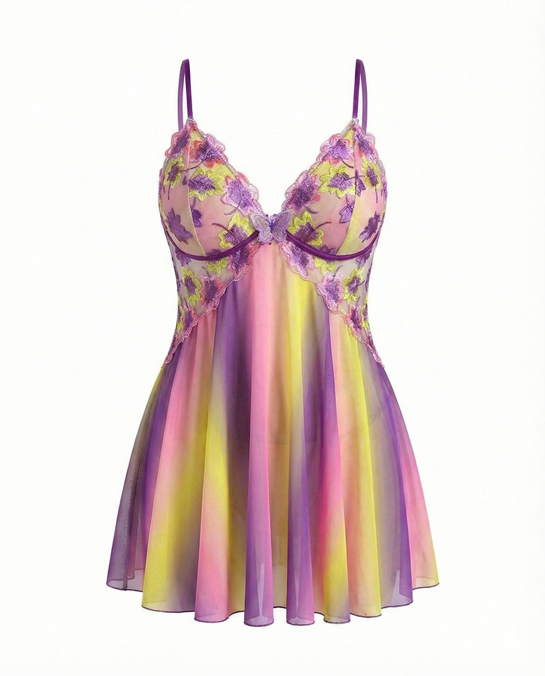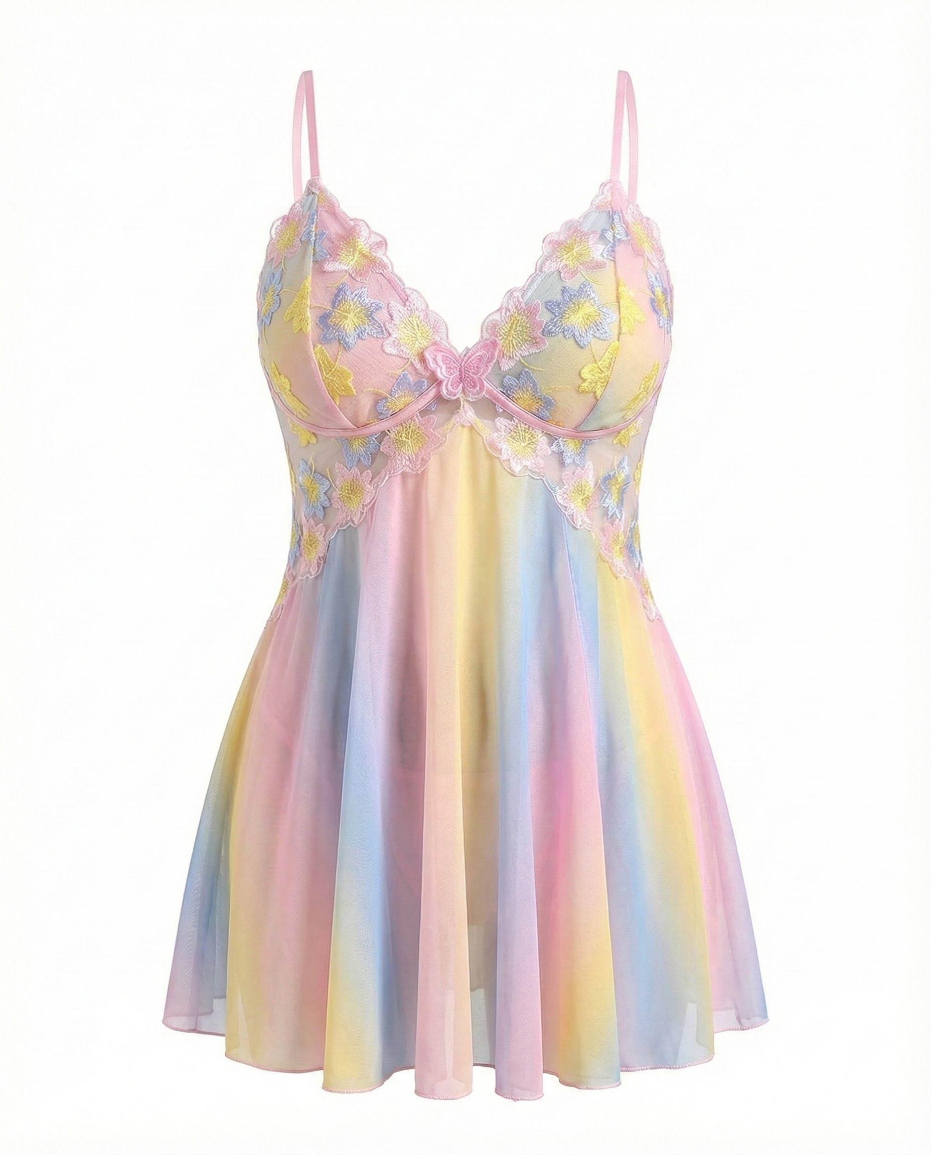 Plus Size Rainbow Ombre Camisole Nightgown – Backless & Floral Mesh Design