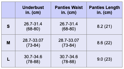 Stockings not included. Skirt, panties, bra and garters are adjustable. Panties are half-crotchless. Please check size chart below.
