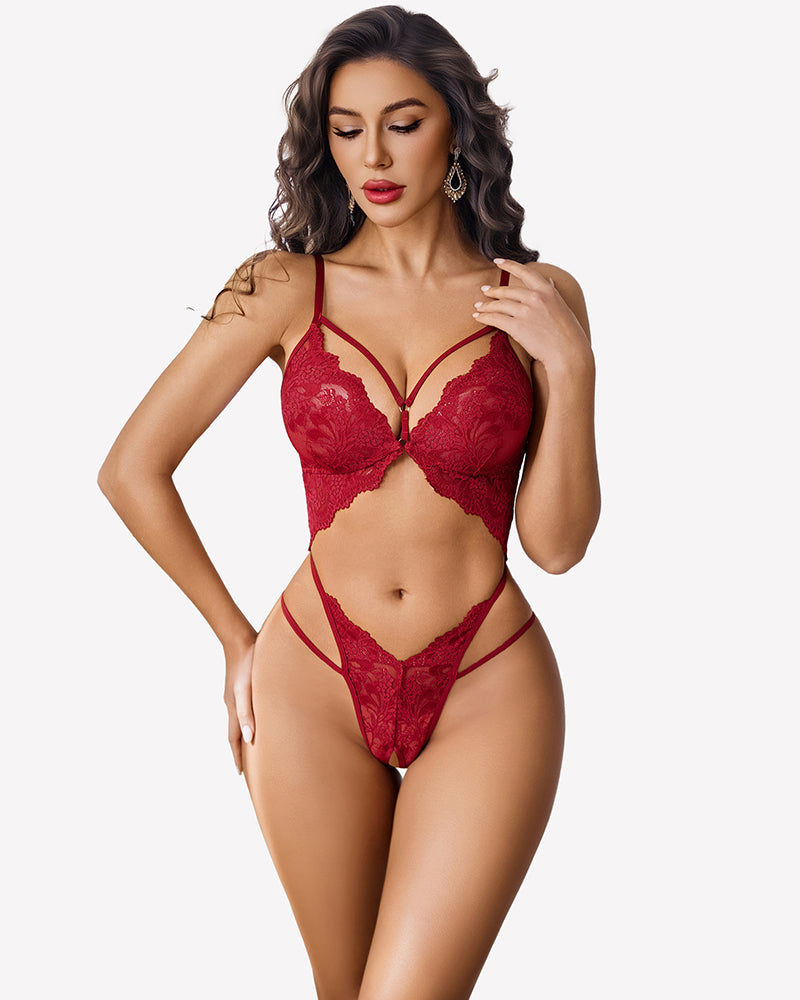Deep V Lace Teddy Cutout One Piece Bodysuit