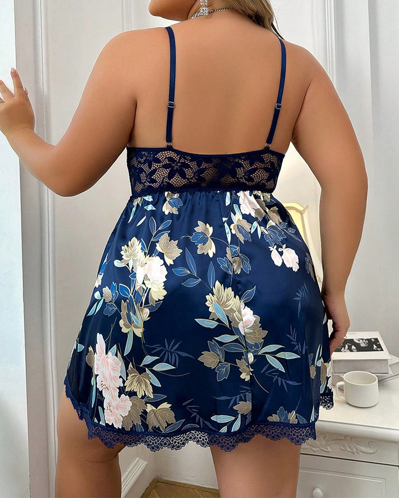 Plus Size Lace Embroidered Floral Sheer Nightdress Set with Thong