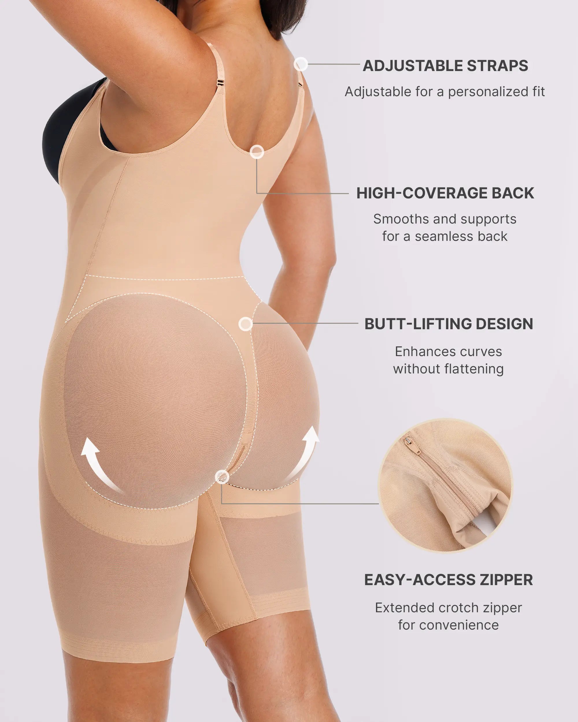 • Butt Lifting: Exclusive T-back design lifts and shapes the buttocks without squeezing.