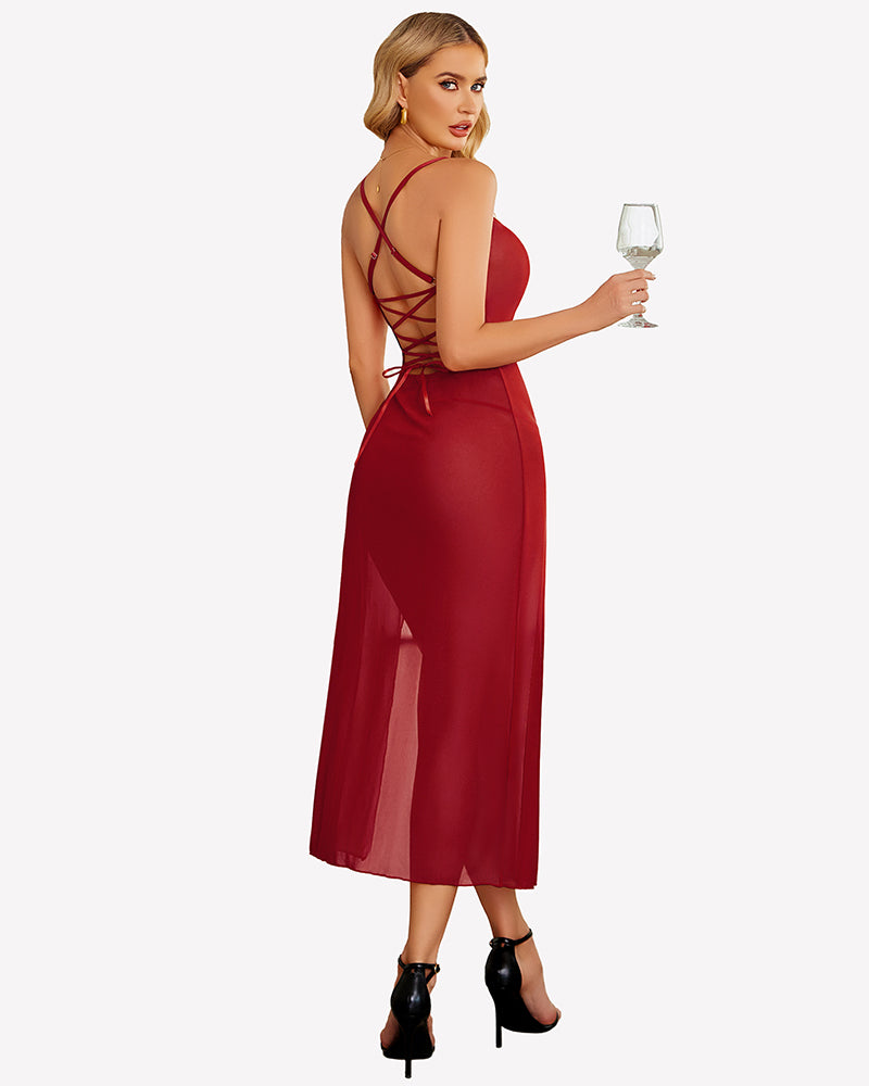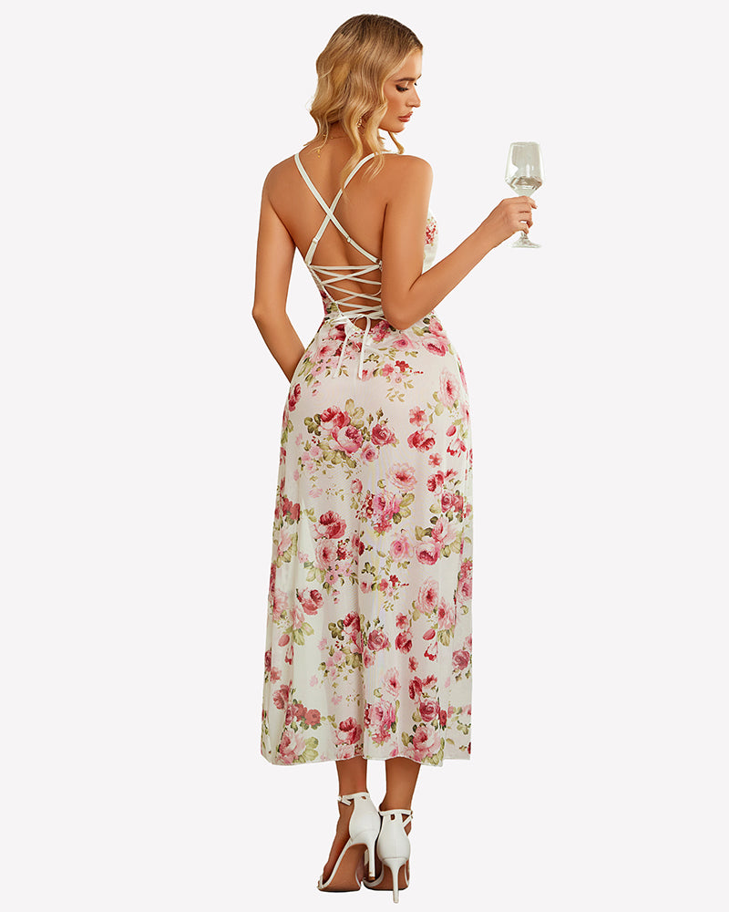 Floral Print Mesh Side Split Nightgown
